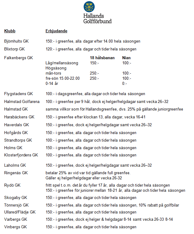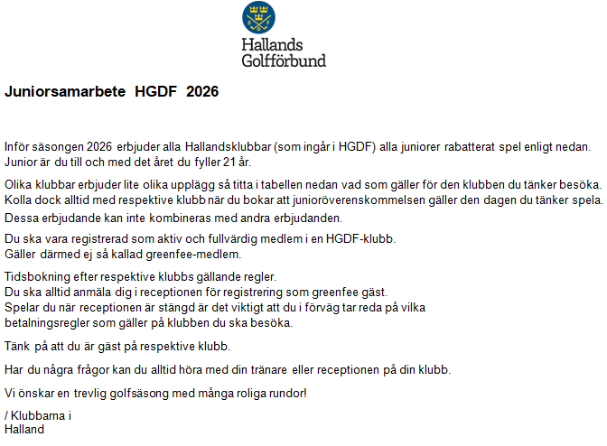 Inför säsongen 2026 erbjuder alla Hallandsklubbar* (som ingår i HGDF) alla juniorer rabatterat spel enligt nedan.