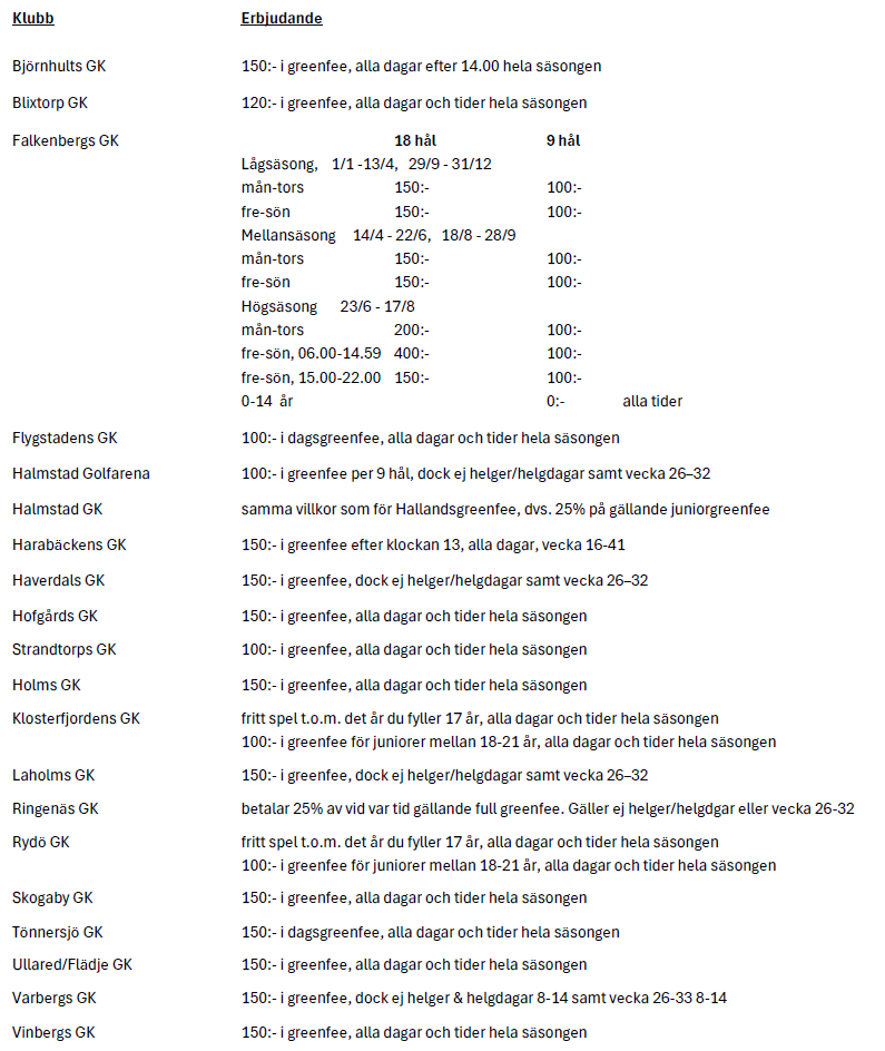 Inför säsongen 2025 erbjuder alla Hallandsklubbar* (som ingår i HGDF) alla juniorer rabatterat spel enligt nedan.